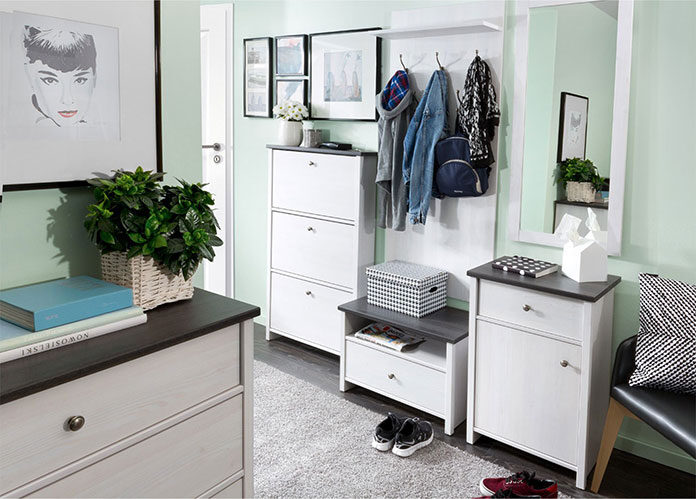 Dobrze zorganizowany przedpokój to klucz do sukcesu. Niech każda szafka i półka służy do przechowywania konkretnych przedmiotów. Jeśli będziemy trzymać się ustalonego systemu, nigdy nic nam nie zginie. Pojemna szafa i wygodne do wysuwania szuflady pomieszczą wszystko, dzięki czemu we wnętrzu zapanuje ład, a ukryte rzeczy nie ulegną zniszczeniu.
