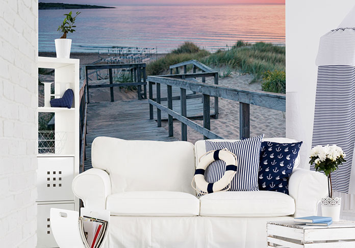 Wydawać by się mogło, że styl marynistyczny to dobry sposób na urządzenie saloniku w letnim domku, ale nie salonu w zwykłym mieszkaniu. Jeśli jednak przez cały rok chcemy się czuć tak, jakbyśmy byli na wakacjach, to jest to bardzo dobry pomysł. Styl marynistyczny ma wiele odmian, ale wspólne barwy. W marynistycznym salonie króluje biel, różne odcienie błękitu, kobalt, łagodne brązy, czasem zieleń. Jeśli zamierzamy pójść w stronę stylu Hampton, który charakteryzuje się wyrafinowaną elegancją, dekorujemy pomieszczenie poduchami, kocami i innymi dodatkami w typowych dla tego stylu odcieniach, ale wykonanych z bardzo dobrych gatunkowo tkanin. Do takiego wnętrza znakomicie pasować będzie fototapeta morze. Ciepłe odcienie żółtego, delikatne brązy, promienie słoneczne odbijające się od tafli morza i liście palm wprowadzą do takiego salonu element luksusu. Równie dobrze będzie tu wyglądać panoramiczny widok na przepiękną plażę Avali nad Morzem Jońskim. Wyrazisty błękit nieba i morza, delikatna zieleń pokrywająca klif i czysta, choć kamienista plaża, podkreślą elegancję salonu. W skromniejszej wersji stylu marynistycznego świetnie sprawdzi się fototapeta Morze Bałtyckie przedstawiająca tak dobrze nam znane, wyłożone białymi deskami zejście na plażę. Swojskość tego widoku wprowadzi spokój do naszego wnętrza, w którym dzięki temu lepiej się będzie odpoczywało.