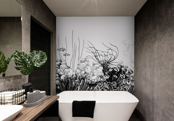 W ostatnich latach bardzo modny w aranżacji wnętrz, w tym łazienki stał się minimalizm. Zwłaszcza w łazienkach jest on pożądany i sprawdza się znakomicie, ponieważ sprzyja odpoczynkowi i wyciszeniu, a przecież o to chodzi w łazience. Styl minimalistyczny jest także bardzo funkcjonalny i podoba się tym, którzy pedantycznie dbają o czystość. W takiej łazience wszystkie akcesoria należy schować do szafek i szuflad, sprzęty i armatura powinny być proste i w jednolitych barwach. Taka monochromatyczność może jednak być nudna. Aby tego uniknąć, wystarczy wprowadzić do wnętrza fototapetę morze, która ze względu na tematykę świetnie będzie pasować do wnętrza, w którym bierzemy kąpiel. Ponieważ jednak styl minimalistyczny nie lubi ostrych kolorów, należy wybrać fototapetę w stonowanych barwach. Fototapeta rafa koralowa w formie biało-czarnego szkicu nie zakłóci stonowanych barw łazienki, a za to uczyni ją bardziej interesującą i wesołą. Prosta, biała umywalka i wanna na tle takiej fototapety ujawnią w całej krasie swój oryginalny design.